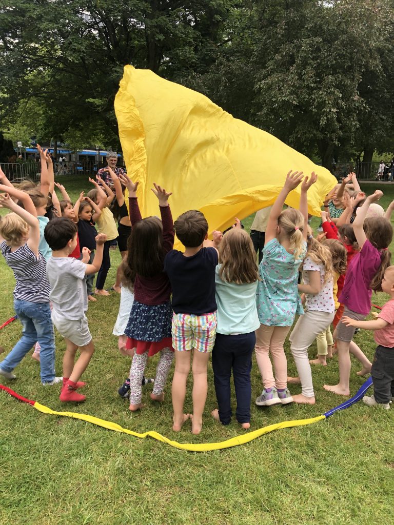 Einmal wöchentlich heben wir ab- eine halbe Stunde kommt beste Schwingung auf, wenn die Tücher, Stange und Reifen in Bewegung kommen. Vorher erwärmen, entspannen und dehnen wir uns gemeinsam- erst Begrüßen, Atmen, Träumen und verschiedene Asanas gemeinsam machen- dann jeder für sich und als Paar kreativ und beweglich sein.